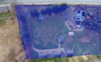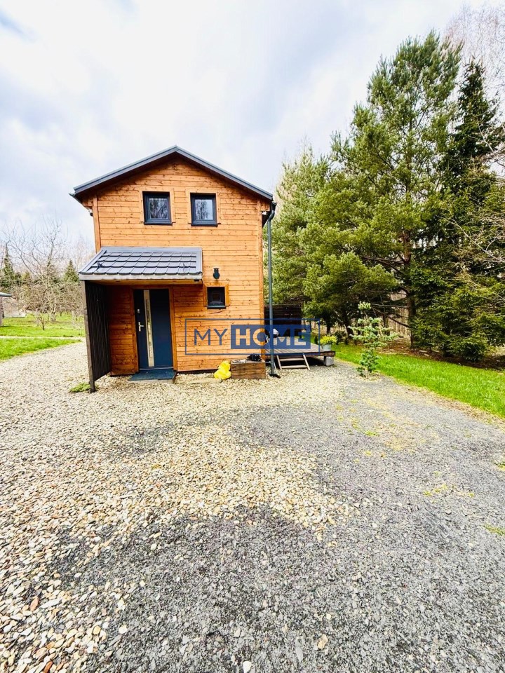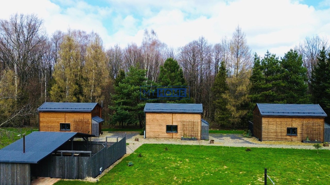 trzema nowoczesnymi, całorocznymi domkami wybudowanymi w 2022 roku, usytuowanymi na dużej, zagospodarowanej działce o powierzchni 7959 m².